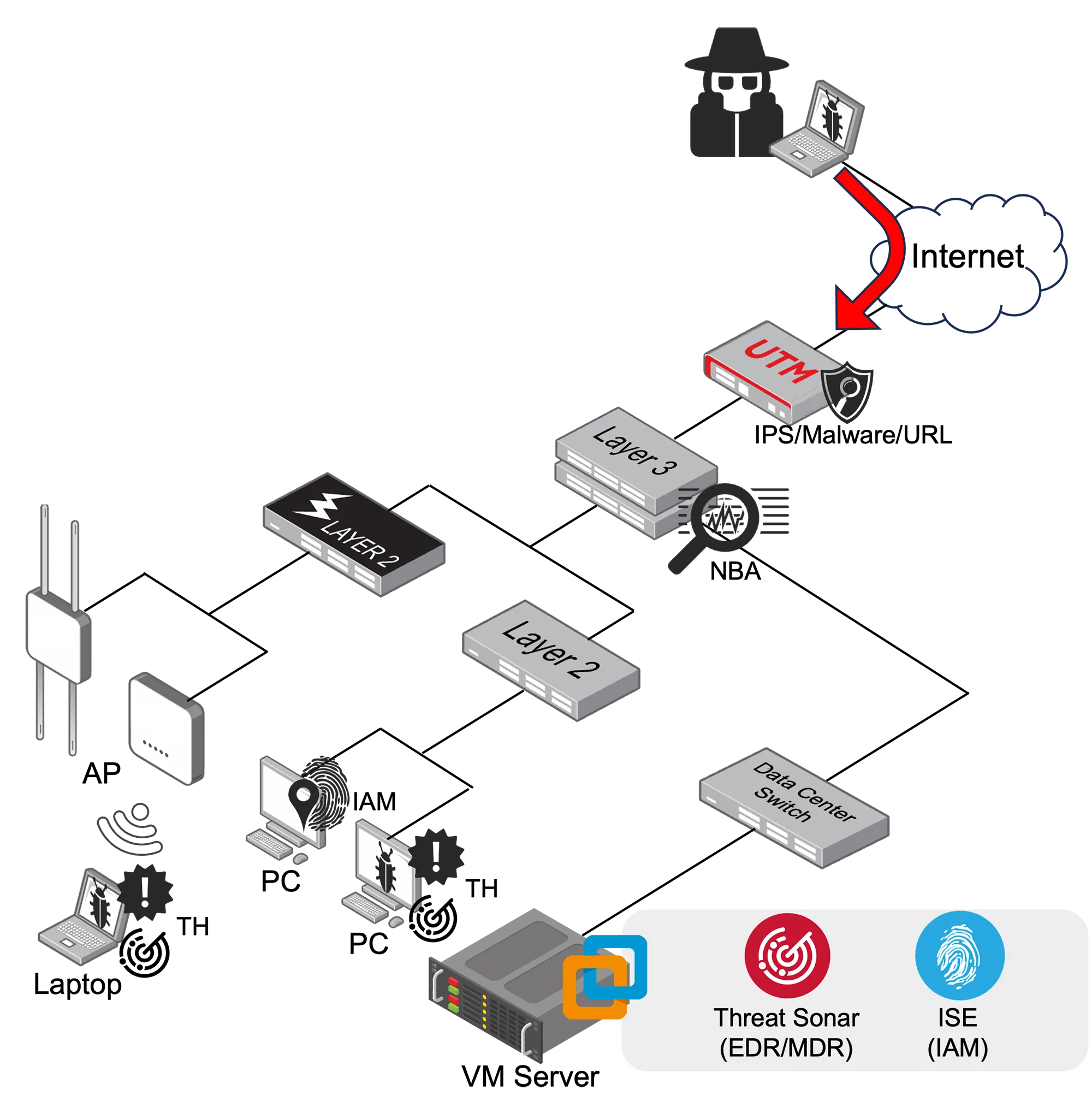 透過多種不同防禦面的資安產品,加強駭客的入侵難度,並提早發現異常處理